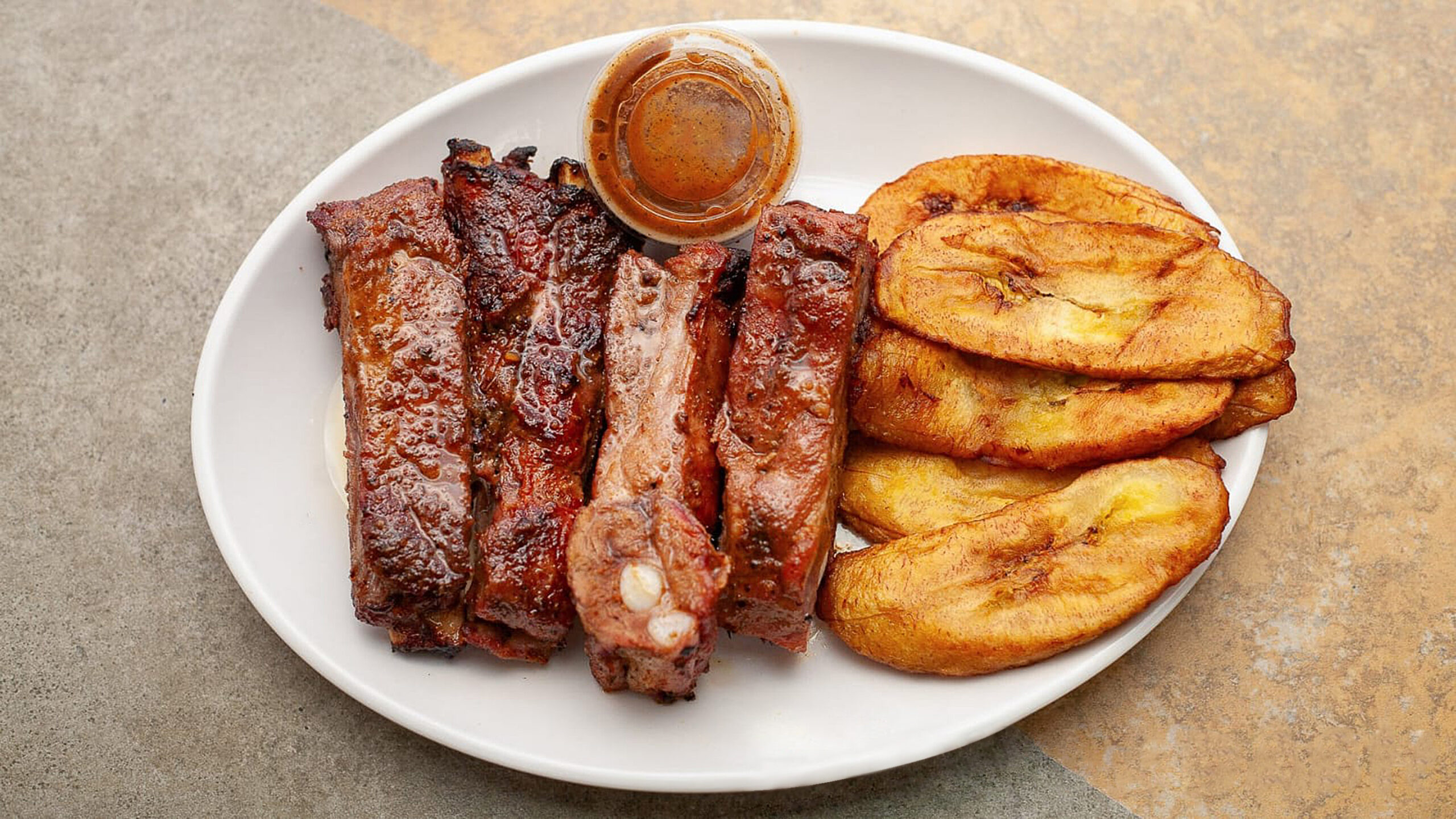 Slow-baked pork ribs seasoned with a special blend of spices and herbs. Served with your choice of two sides: flavorful fried rice, fried ripe plantain, or fresh sautéed spinach.