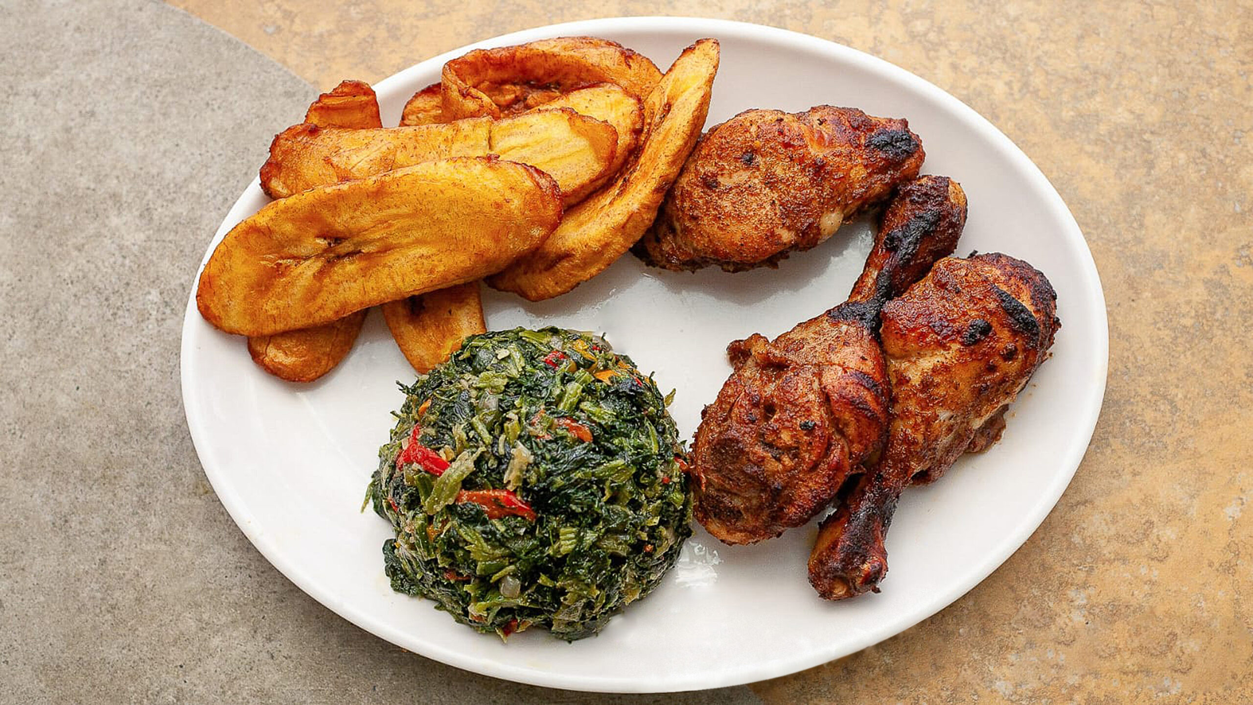 Tender grilled chicken marinated in our signature spice blend. Served with your choice of two sides: savory fried rice, sweet fried ripe plantain, or fresh sautéed spinach.