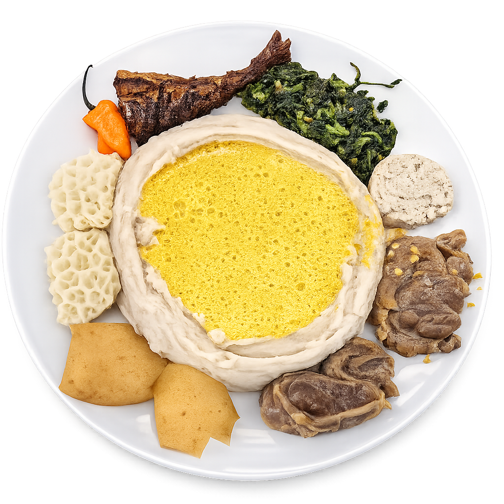 Our Achu features perfectly pounded cocoyam topped with aromatic yellow palm-nut soup, served with a selection of premium meats, smoked fish, and fresh vegetables for an authentic Cameroonian experience.